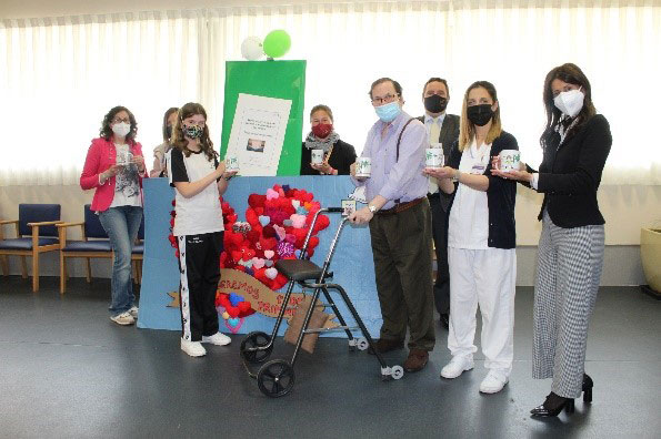 Los alumnos querían enviar por medio de la taza toda su energía, fuerza, ánimo y buenos deseos a las “abuelas y abuelos” de la Residencia. Tomando todas las medidas especiales necesarias marcadas en los protocolos antiCOVID-19, se realizó en las instalaciones de dicha Residencia una entrega simbólica de las tazas a uno de los residentes por parte de Sandra, la ganadora del concurso de dibujo. También estaban presentes su madre, la profesora tutora de 6ºA y la jefa de estudios de Primaria en representación del Colegio. Por parte de la Residencia asistieron su directora, una animadora sociocultural y una auxiliar, así como un representante del Grupo INFICAL®, que a su vez es padre de un alumno del Colegio Valle del Miro. También hicieron entrega de un mural realizado con corazones confeccionados por los alumnos de 1º de Primaria con la frase “Os queremos”.